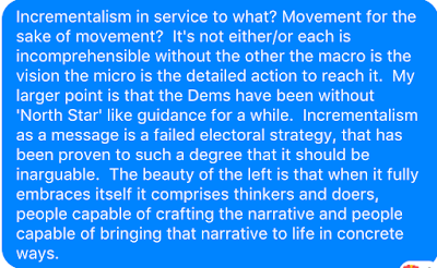 This kinda brings me back to the distraction, which I guess has become the thing I'm writing about, and the idea of the moral position and how I now see the schism on the left. In the conversation with my friends we had a back and forth about incrementalism vs. what we were calling radical change. Even as the discussion continued there was friction around the binary we were using, it never quite fit. One friend, thinking systemically, saw it as macro vs micro*, which I now do as well. The friction was that we were calling radical ideas that were not only practical but were being applied in real time. Things like single payer, for which there is a well funded lobby behind making it seem radical. Looked at in this way it becomes incrementalism vs. doing what almost every other nation does. If we think of it as macro vs. micro, we are discussing specific structural changes and specific actions to help bring about those changes, Dems have been all action and no vision. In a sense these are the functions that the two wings of the party serve, vision and practical action. The progressive left provides a vision that tries to center moral clarity and the liberals provide practical direction for reaching the vision. If, knowing that 28 million people still lack healthcare, you have argued against single payer you can't be offended if this equation leaves you off the side of moral clarity.